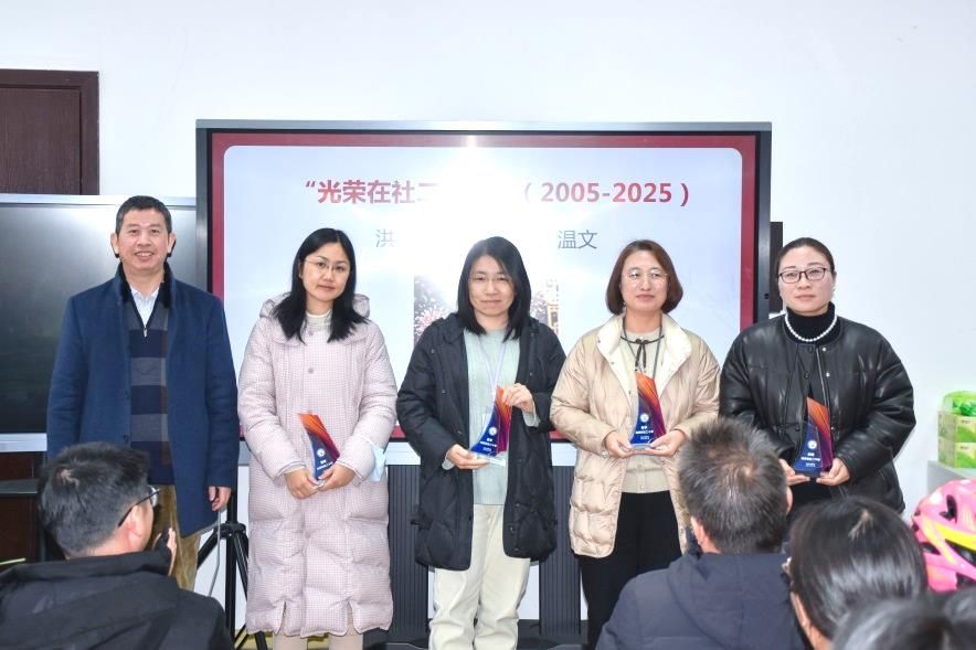 大会还颁发了“光荣在社二十年(2005—2025)”奖杯。魏琼、温文、赵宇、洪鸥老师分别发表获奖感言和新年祝福。