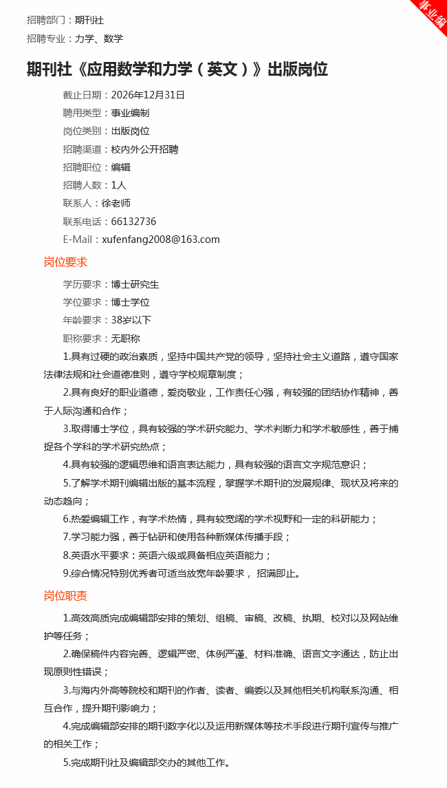 欢迎应聘期刊社《应用数学和力学(英文)》出版岗位